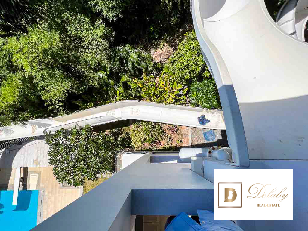 74 meter slide starting from the 3rd level of the villa and going out into the swimming pool.