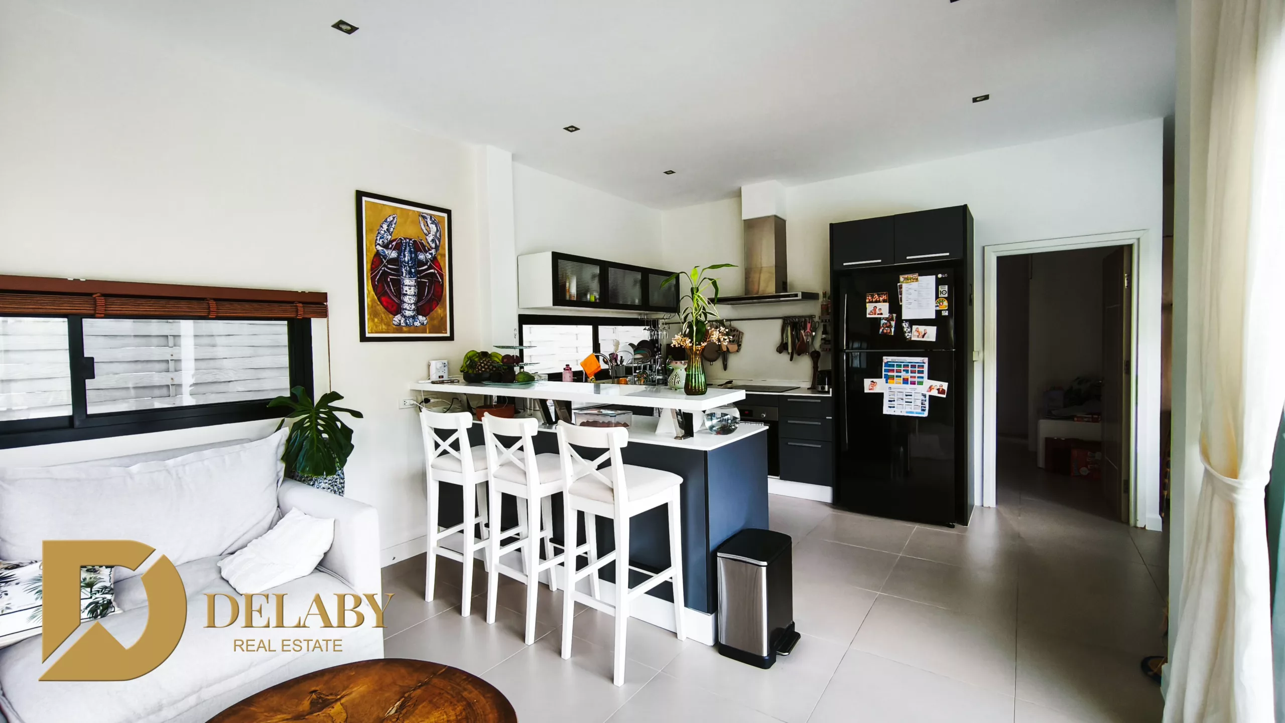 Large living room and open-plan kitchen, sold fully furnished and equipped.