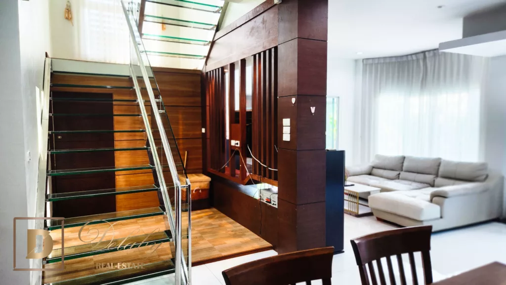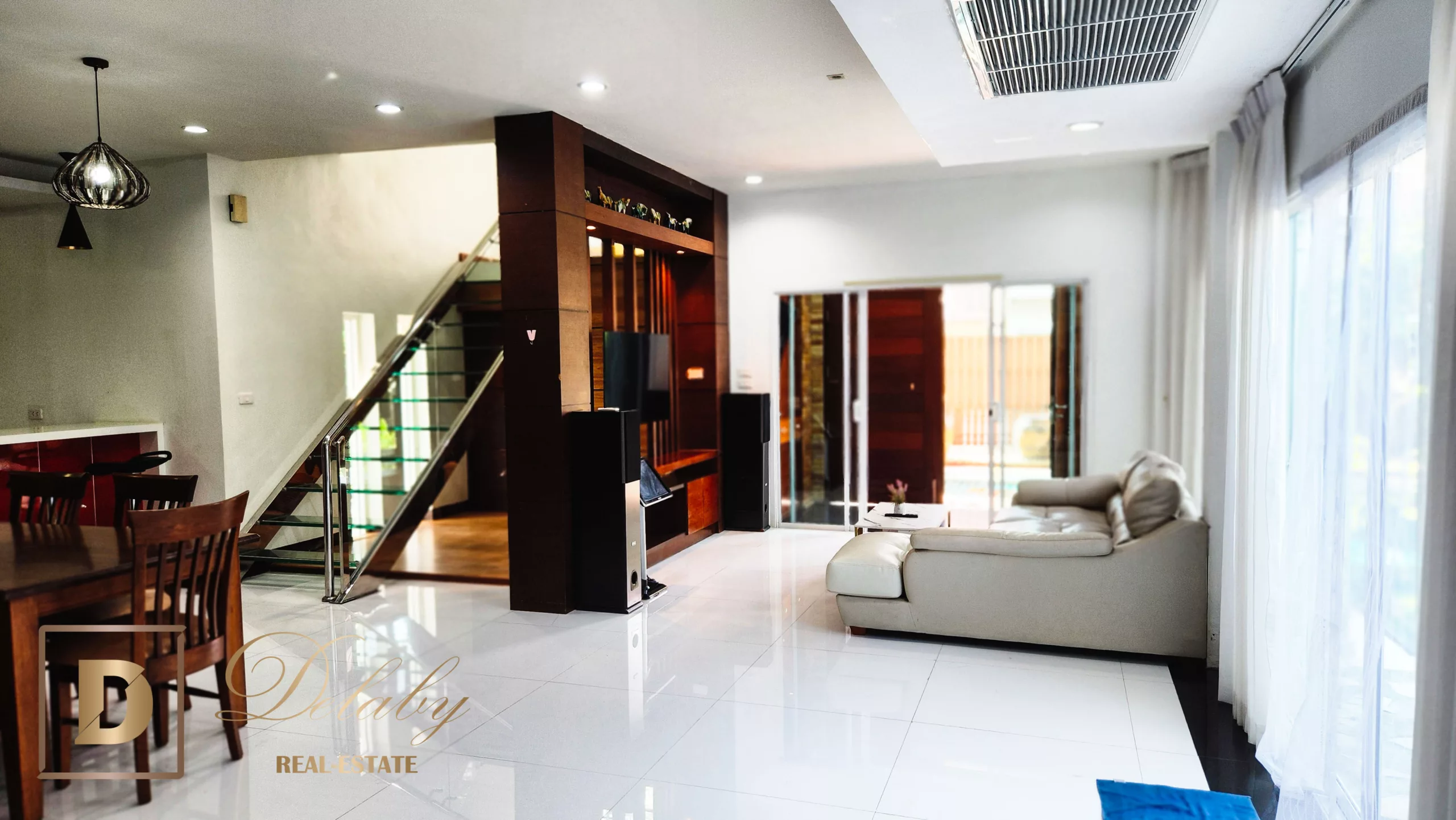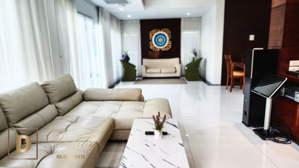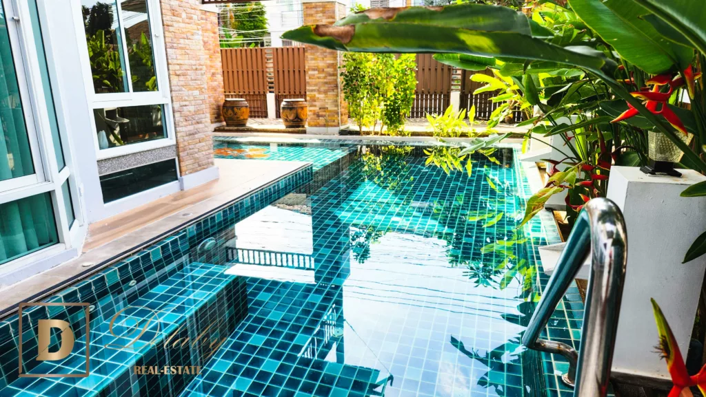 In a beautiful residential area, this 3 bedroom villa, equipped kitchen, living room, swimming pool, sauna is built on 2 levels.